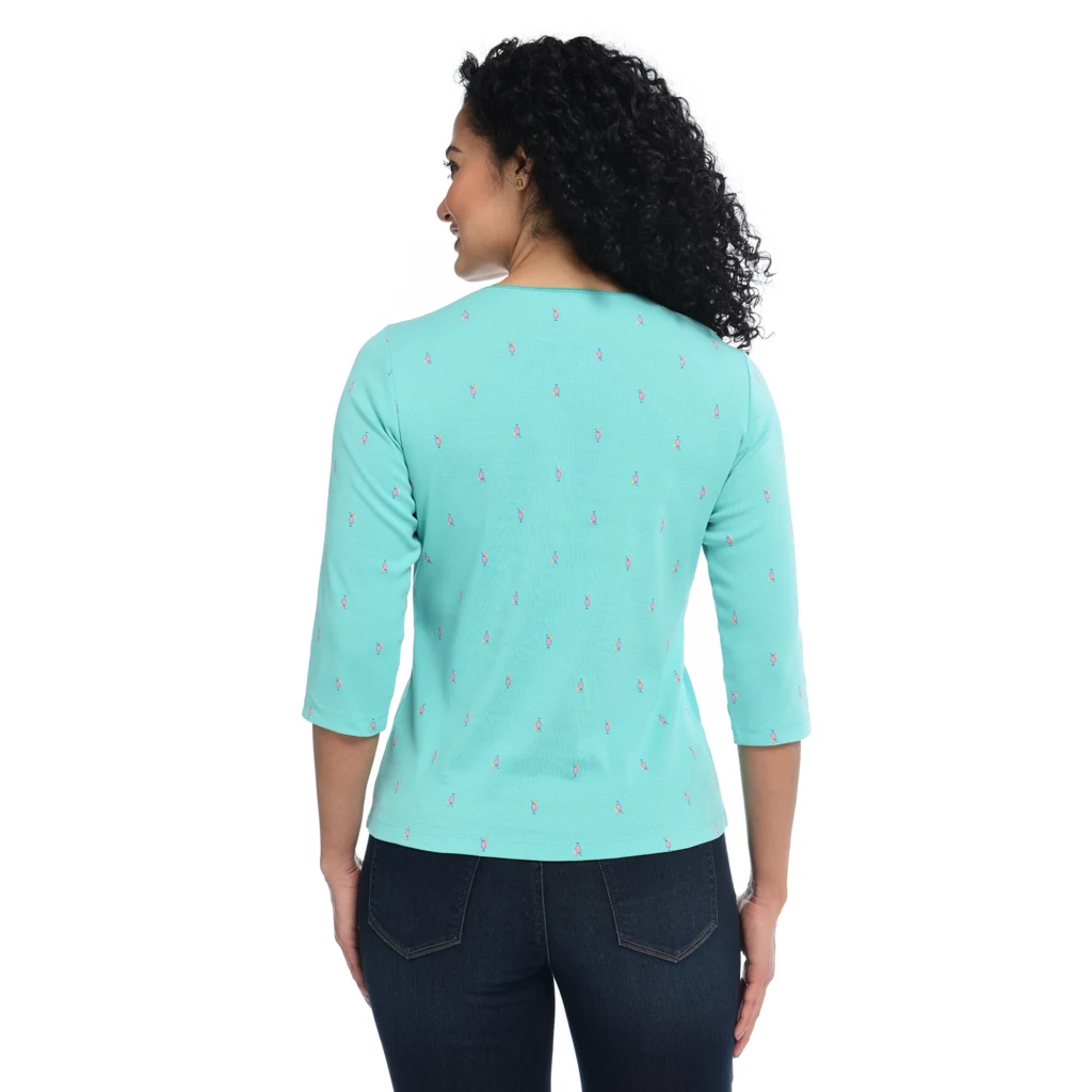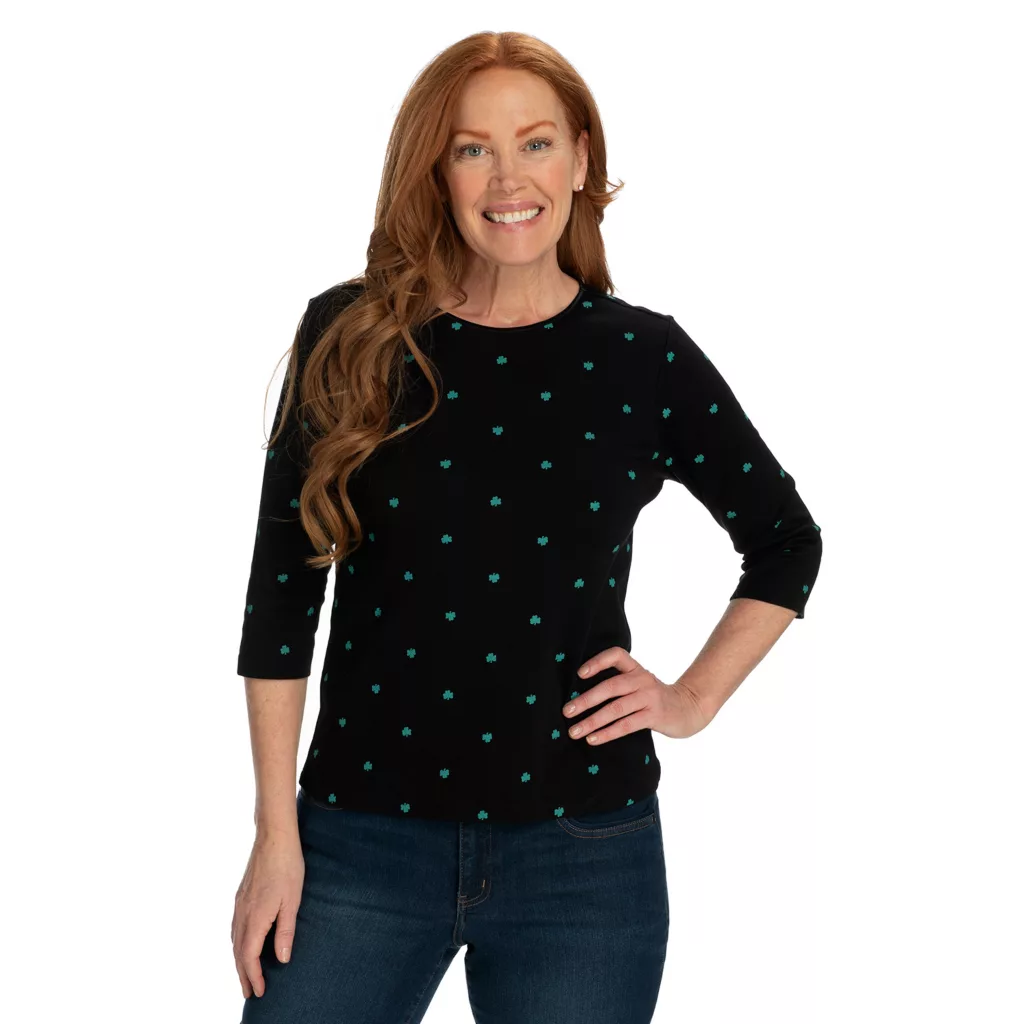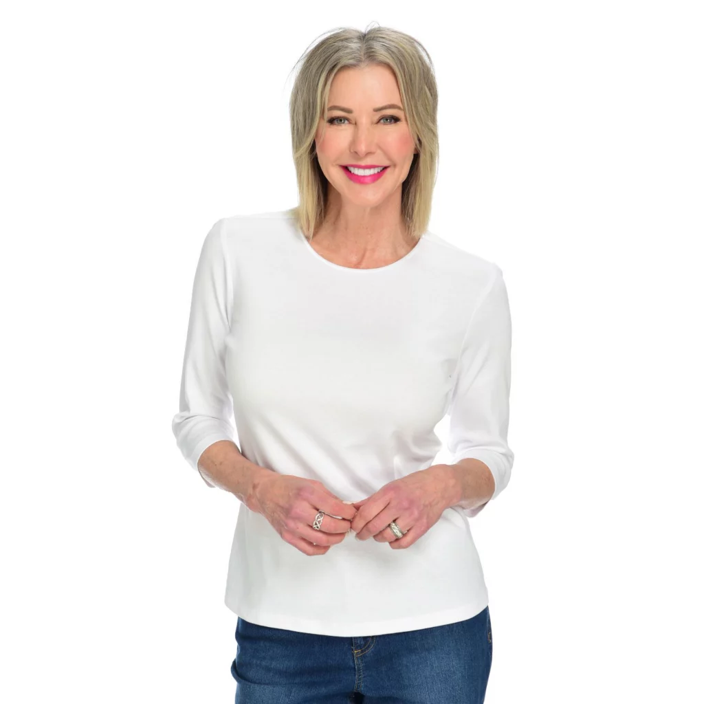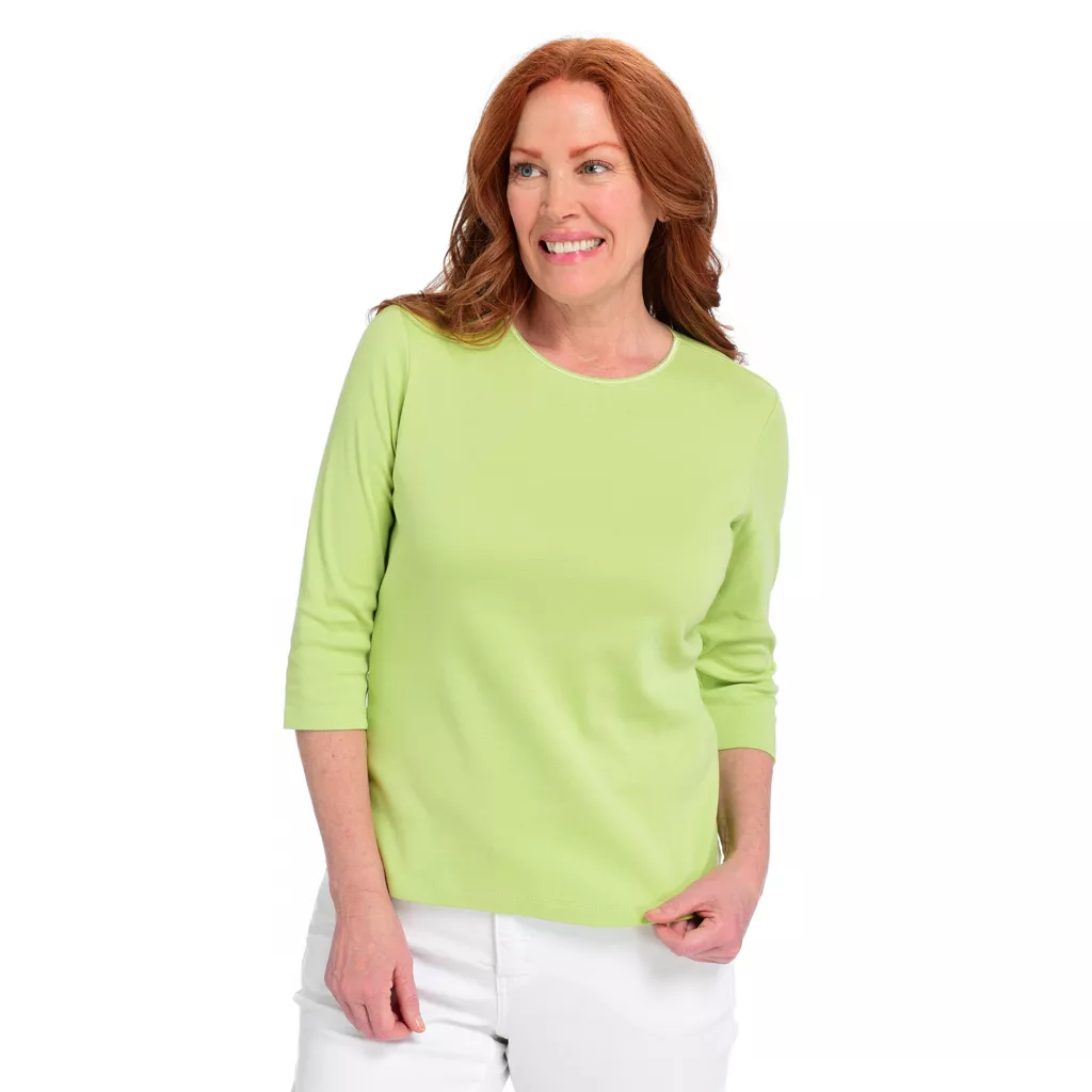 Polished ease to help you seize the day. Satin trim at the neckline adds a touch of elegant shine to this solid tee. It’s crafted using lightly ribbed cotton for a super-comfy fit. Great to dress up a pair of jeans or to top off a ponte skirt. Jewel neckline is the perfect shape for a necklace!