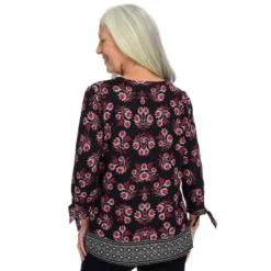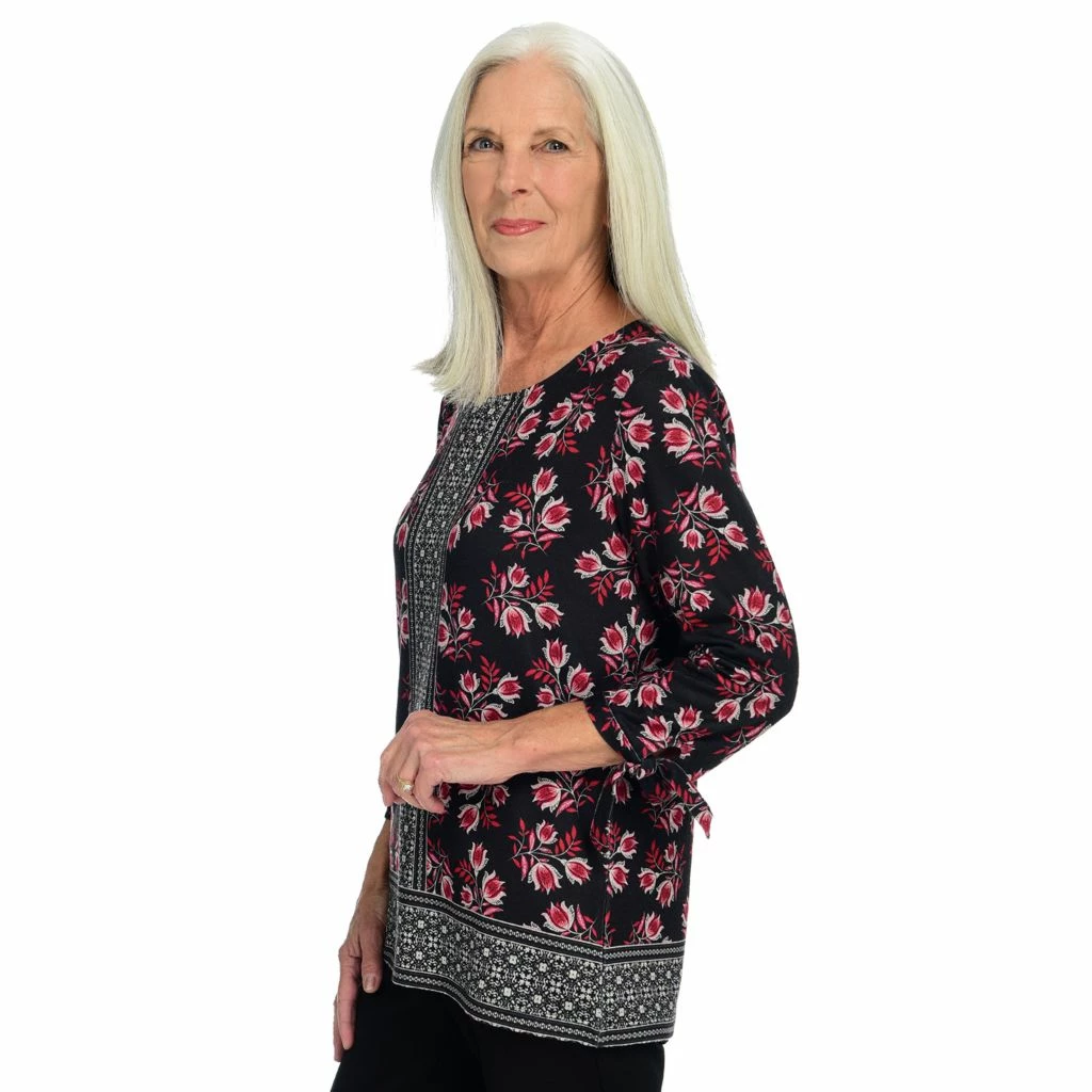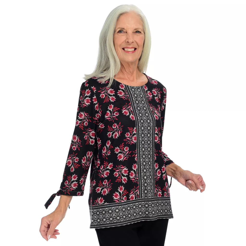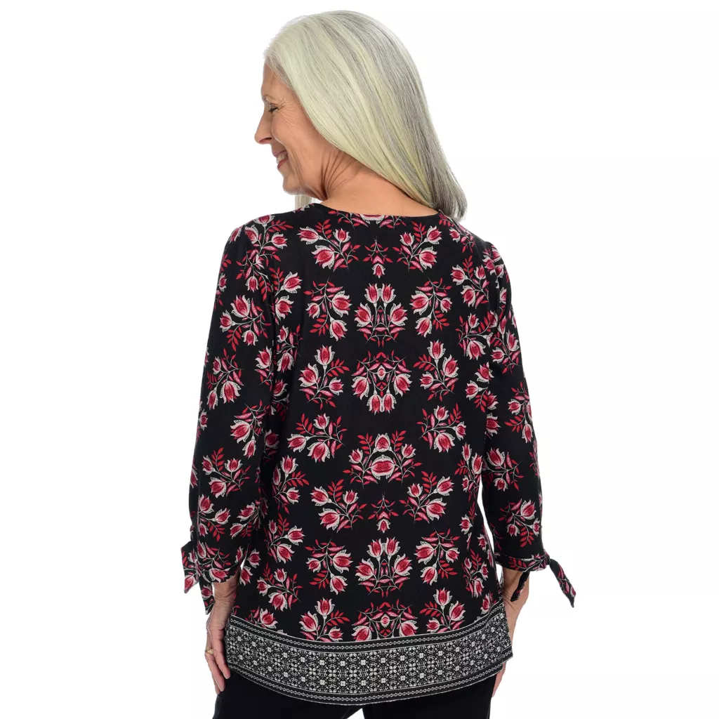 Elegantly designed for comfort, this super-soft top features a border print pattern designed in-house by C&B artists. Functional tie sleeves completes the details for a shirt that goes from office to special occasion.