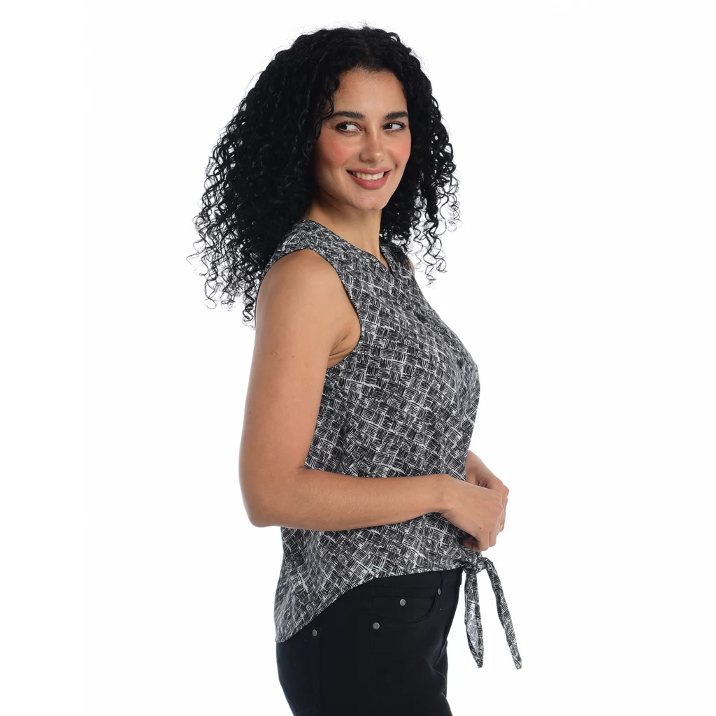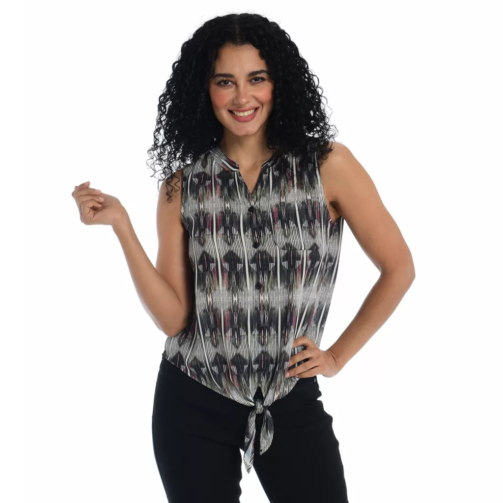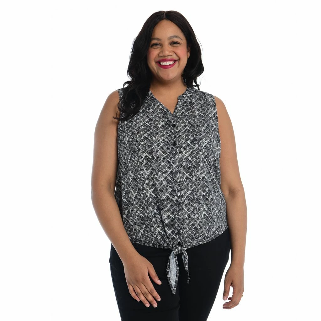 Introducing our must-have Drapey Woven Top. Crafted in 100% polyester for a luxe feel, it’s the epitome of style meets ease. Not sheer, this lightweight piece offers effortless sophistication. With a full button front, adjustable tie, and a flattering curved hem, it’s versatile and chic. Perfect layering companion, available in three exclusive prints for endless styling possibilities.
