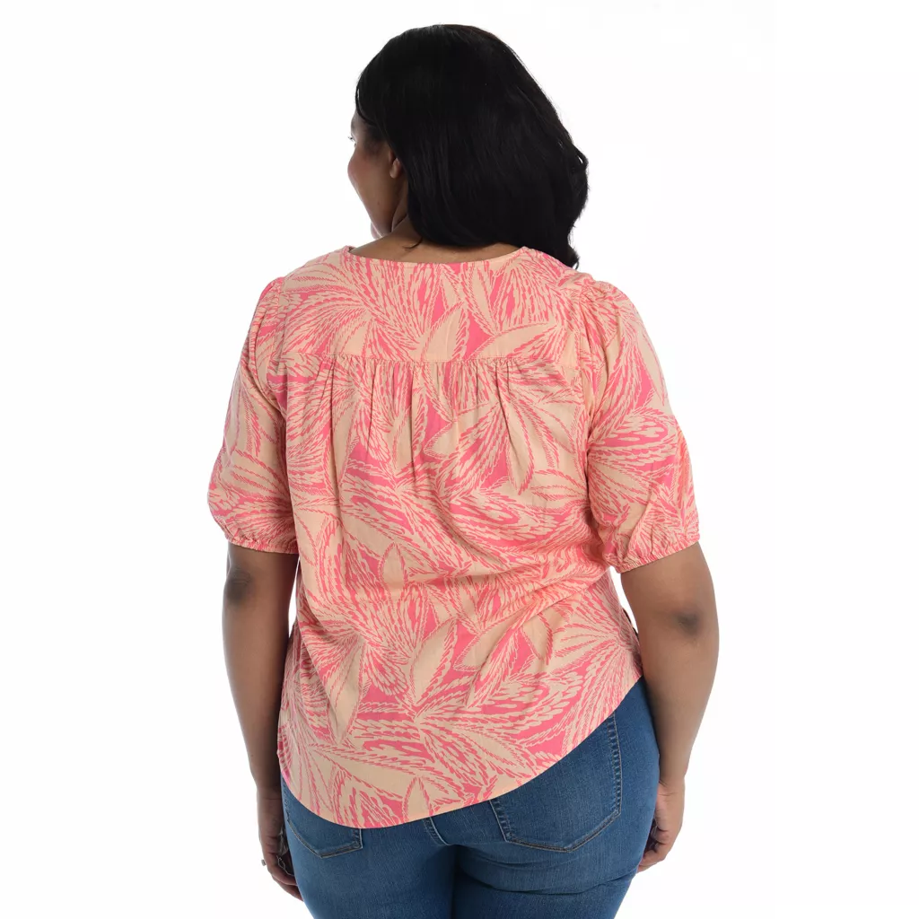 - Shirt Length: Missy(m): 26.5″; Woman(1x): 28.5″; Petite(m): 25.5″