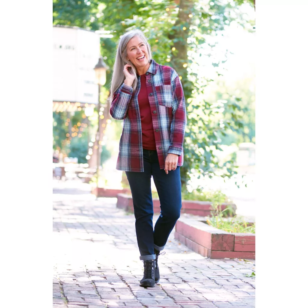 - Shirt Length: Missy(m): 31″; Woman (1x): 32″; Petite (m): 29″