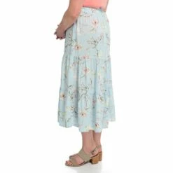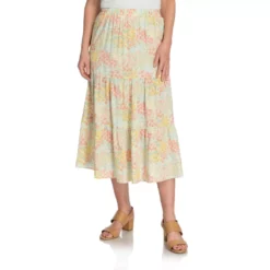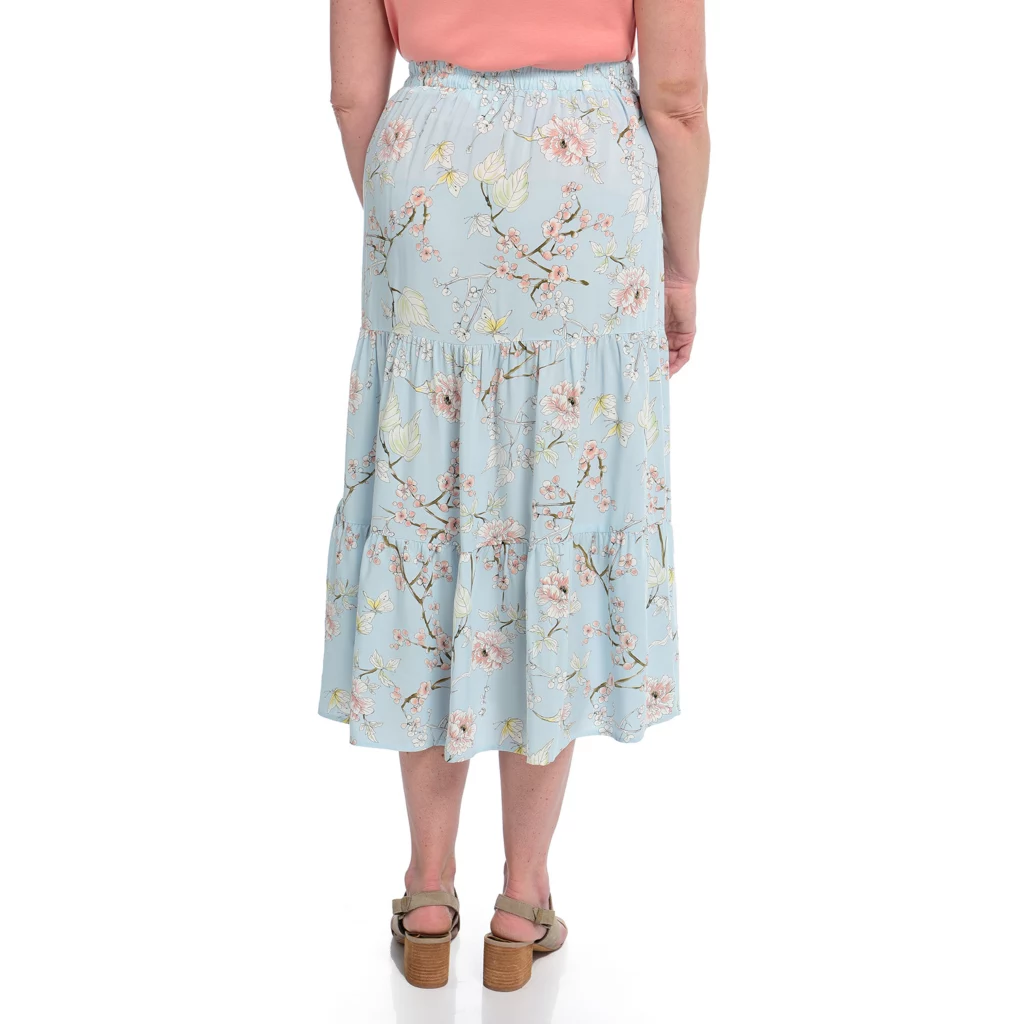 Welcome skirt season! This tiered-style skirt is the perfect palette for the placed floral pattern that flatters from every angle. Fabrication is especially smooth and cool to the touch. It’s a great length to wear at the waist with a perfect tee or the matching floral printed top for a two-piece dress look.