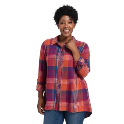 Take plaid to the next level in this feminine tunic top. Draped silhouette and soft textured fabric make this a go-to shirt for cabin weekends and office days. Wear it open or buttoned, with the option to make the sleeve length long or 3/4. The versatility is endless with the tunic length to pair with jeans, leggings, and trousers.