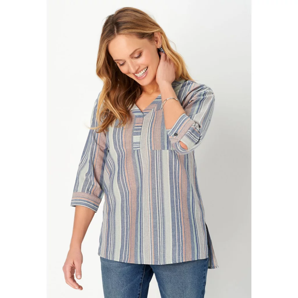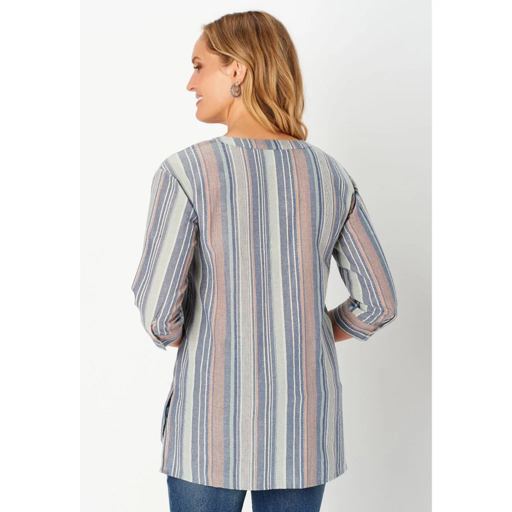 Featuring a mix of thick and thin vertical stripes in muted tones, this woven tunic is a cute, comfy top you’ll reach for again and again. Perfect to wear with leggings or a pair of jeans for a casual look, as well as your favorite white or colorful pants for easy outings.