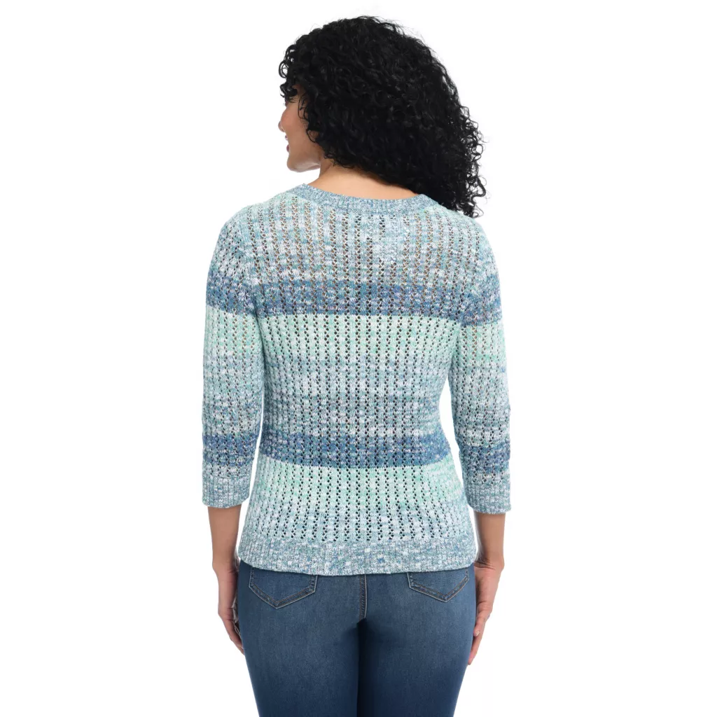 Beautiful and breathable, this sweater features colors that melt together in an open-stitch textured pattern. Pair a cami underneath for a look that’s perfect for breezy days!