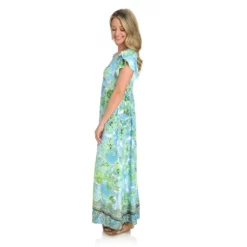 Casual and cute, this One World maxi dress is made of a brushed terry knit with soft hand and border print hem. The ankle-length maxi makes this dress perfect for petite heights. Feminine short tulip flutter sleeves and a unique scoop cage neck with embellished cinch detail add their own flourish to this stunning silhouette.