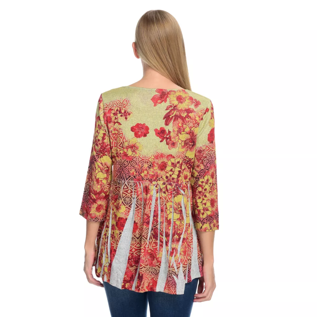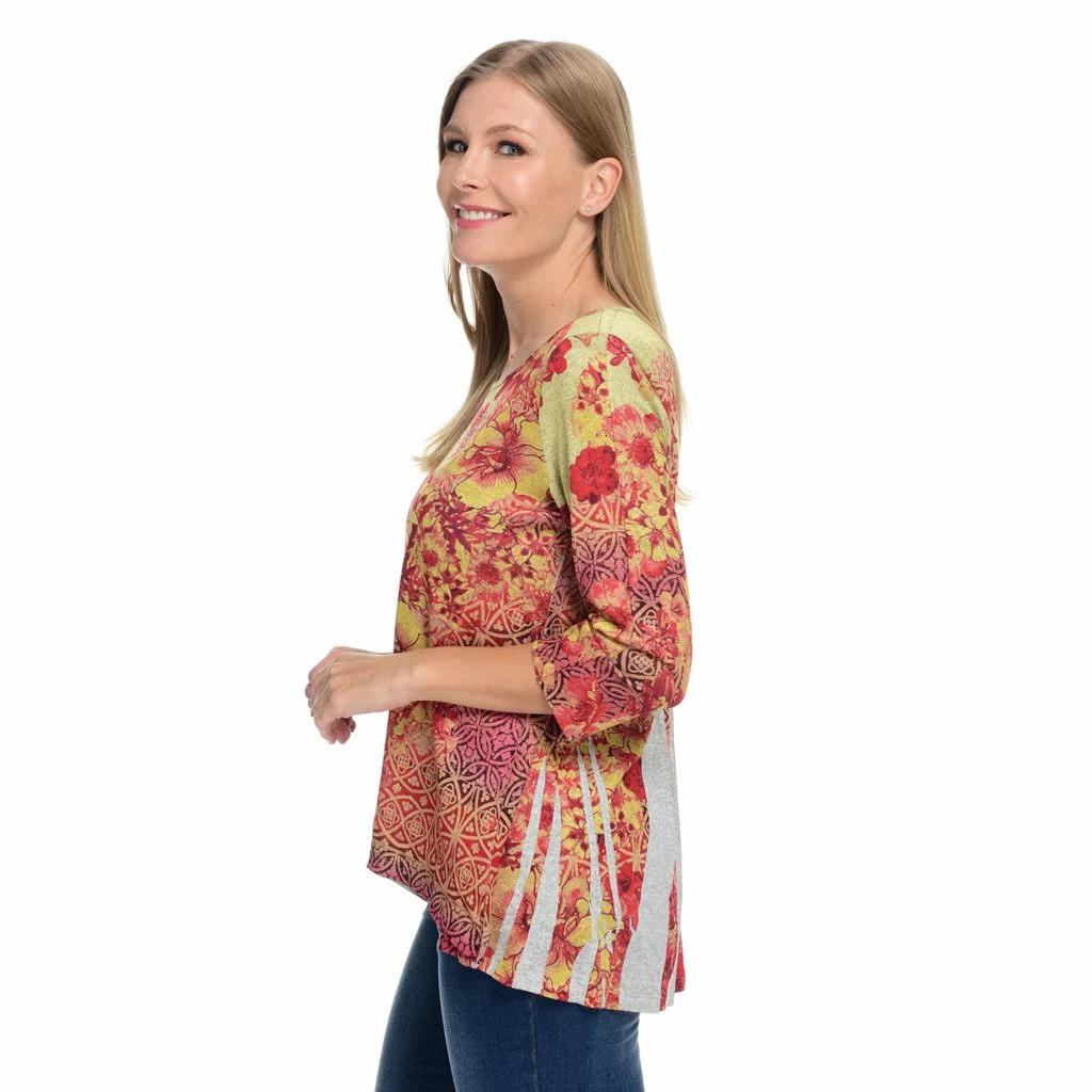 Great weight hacci knit makes this the perfect sweater for transitioning seasons. A bustle back design adds fun drama while an embellished neckline gives that extra pop of bling! Tying in the on-brand One World sublimation print, this sweater is a must-have in your wardrobe.