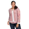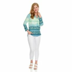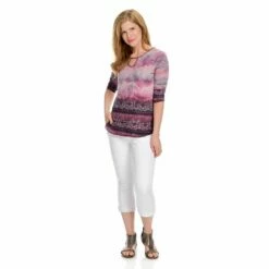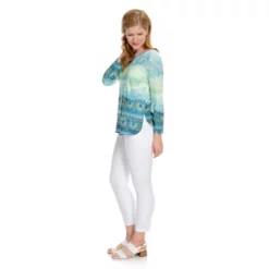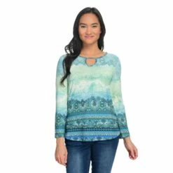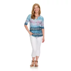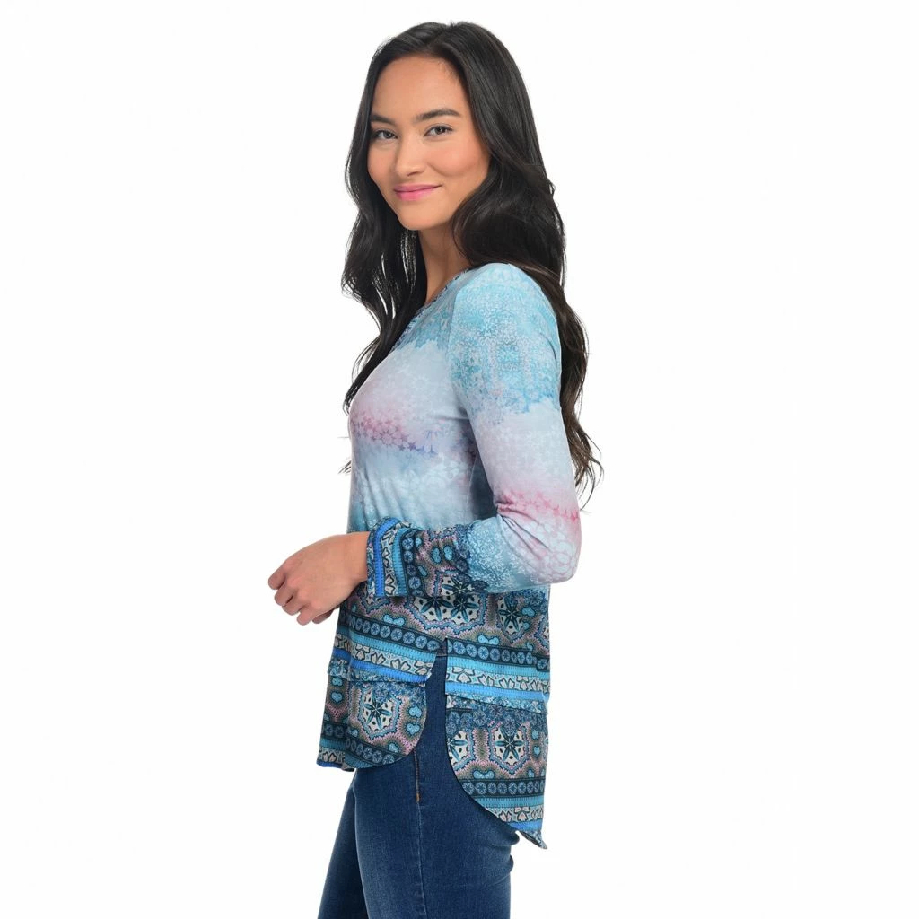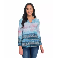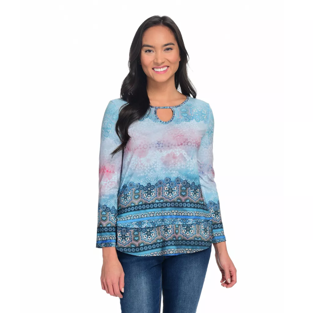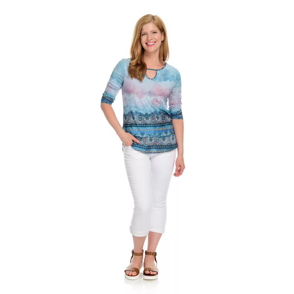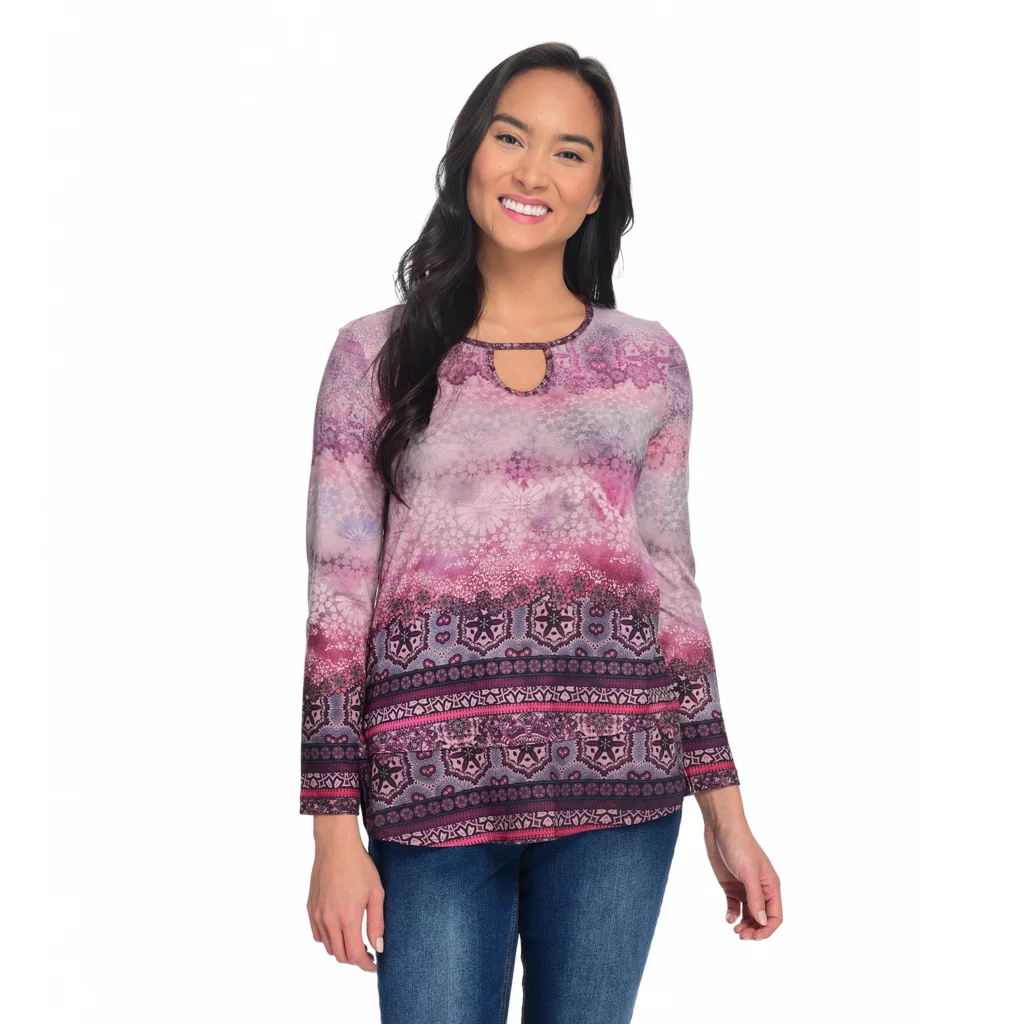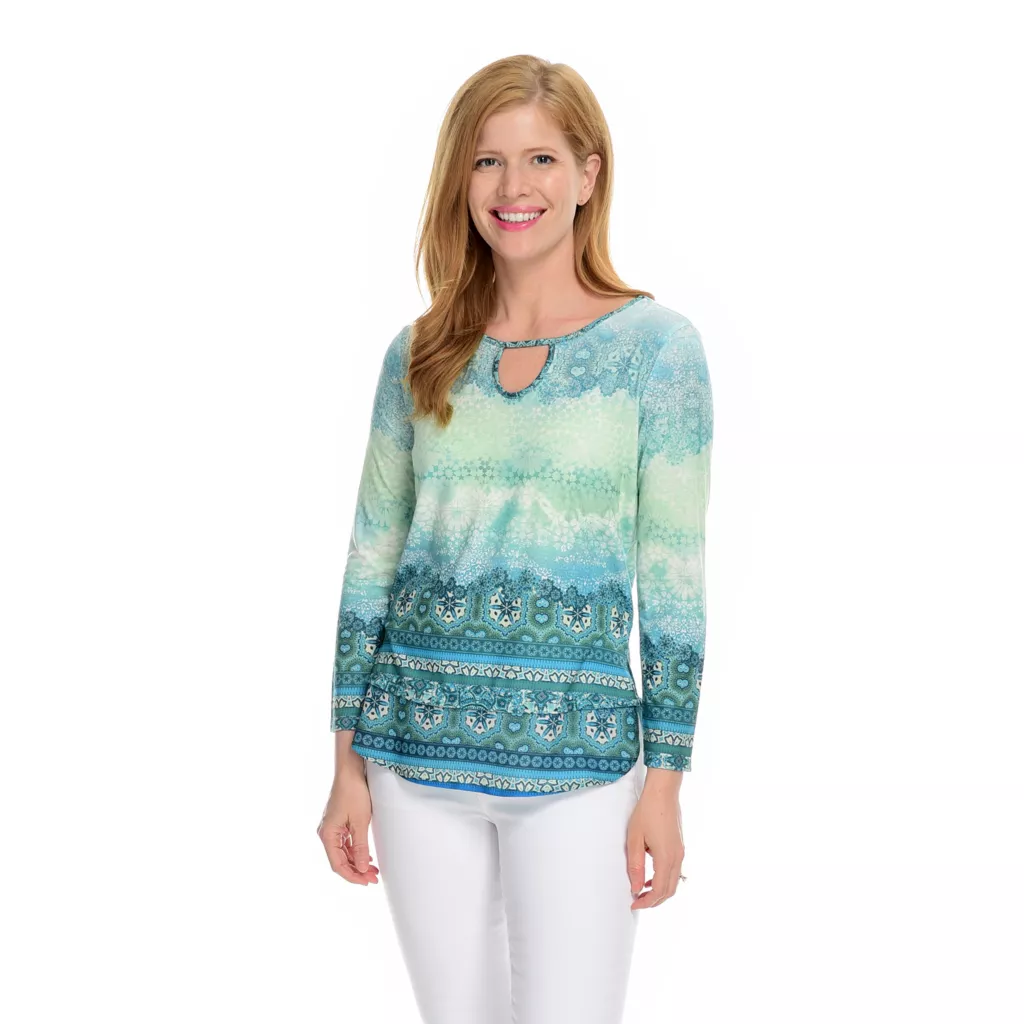Stand-out stylishly in this keyhole top from One World! Most of the top is a soft knit fabric, however, chiffon woven trims the hemline in a layered-looking fashion. A mix of prints seamlessly cover both fabrics, giving it an eye-catching appeal. Rock it with your favorite pair of jeans for a can’t-go-wrong chic and casual look!