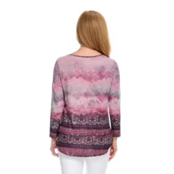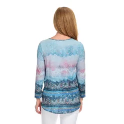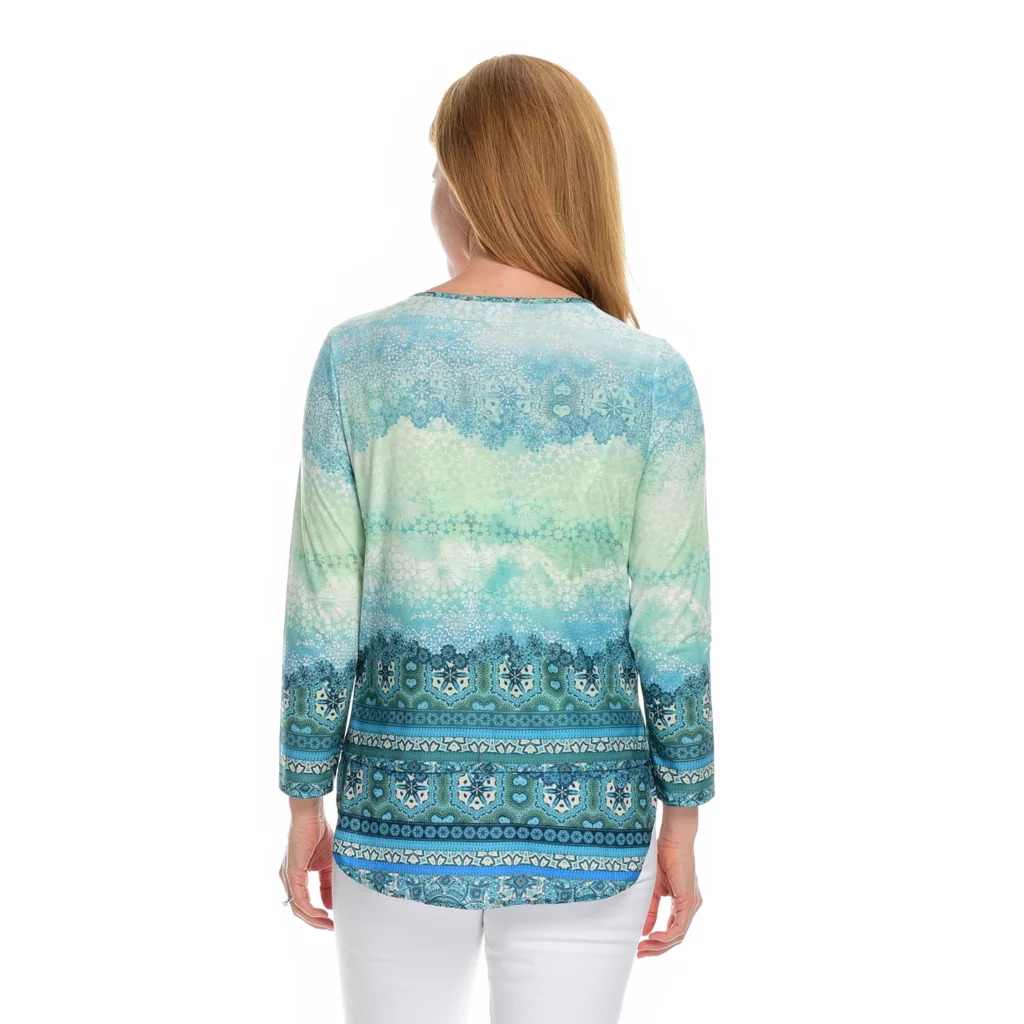 One World Printed Knit 3/4 Raglan Sleeve Lace Bib Detailed Round Neck Top
