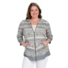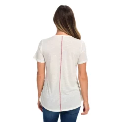 Texture, pattern and color play upon one another in a beautiful display of Americana! This sublimated flag printed tee begs to be worn to a picnic or parade. The semi-sheer knit main serves as the lightweight background for the distinctive printed flag. Color continues in accent stitching along the side seams for an allover aesthetic consistency. Accessorize with your prettiest reds, whites and blues for a look that unmistakably patriotic!