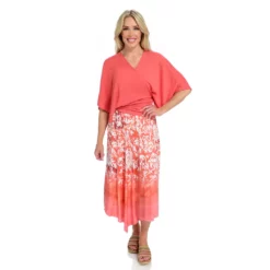 - Model Notes: Model in Coral is 5’6″ with a 34″ bust and 26″ waist; wearing size Small