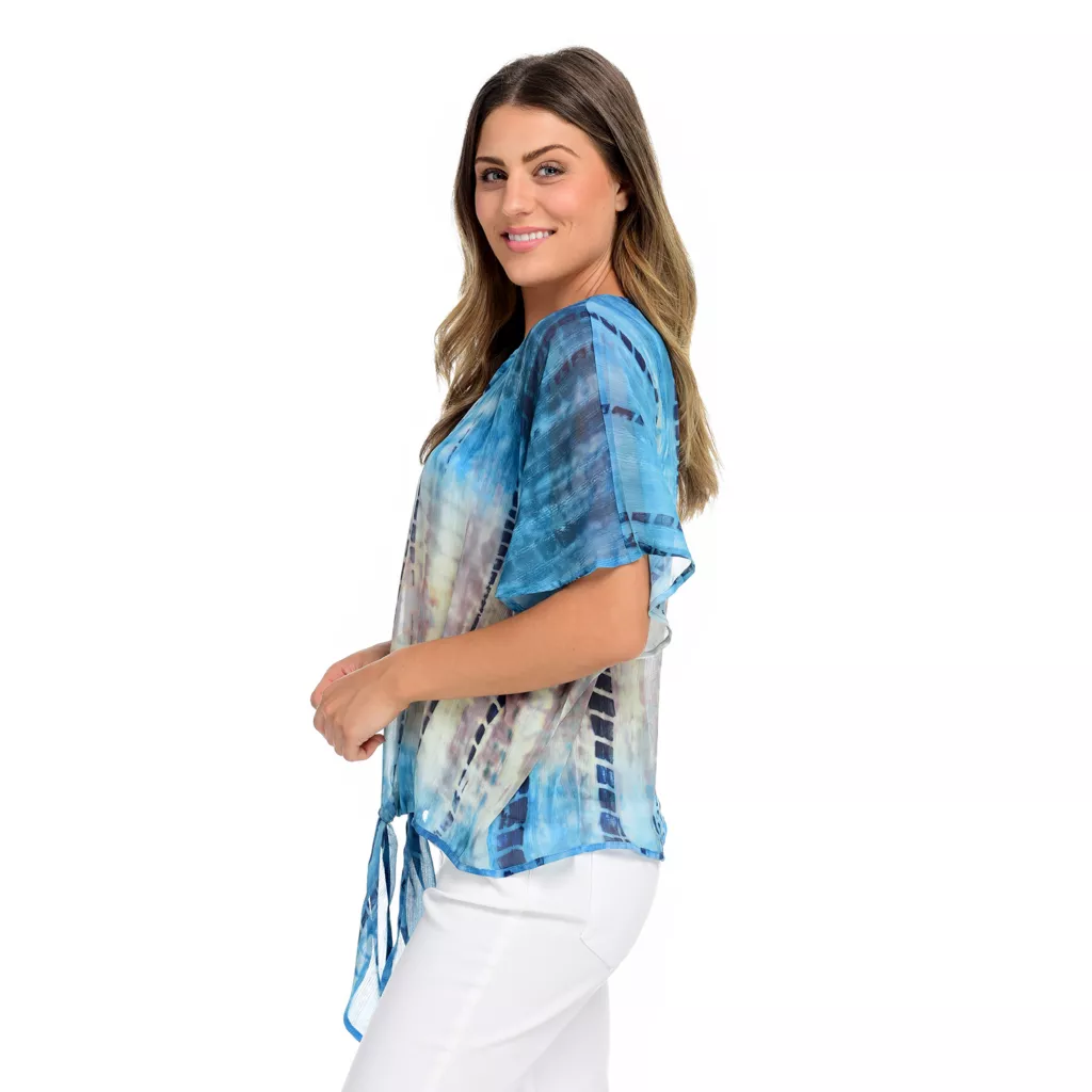 All you need is your favorite pair of jeans to complete this One World outfit! A woven tie dye overlay floats on top of a printed knit tank top, the combined appearance making for a striking impression. The style of this garment offers light coverage with plenty of breezy moment . A tie detail at the bottom hem of the overlay layer mixes up the silhouette to suit your style. Both pieces sport v-necklines so you can show off your accessory game with a cute necklace to finish off the look!