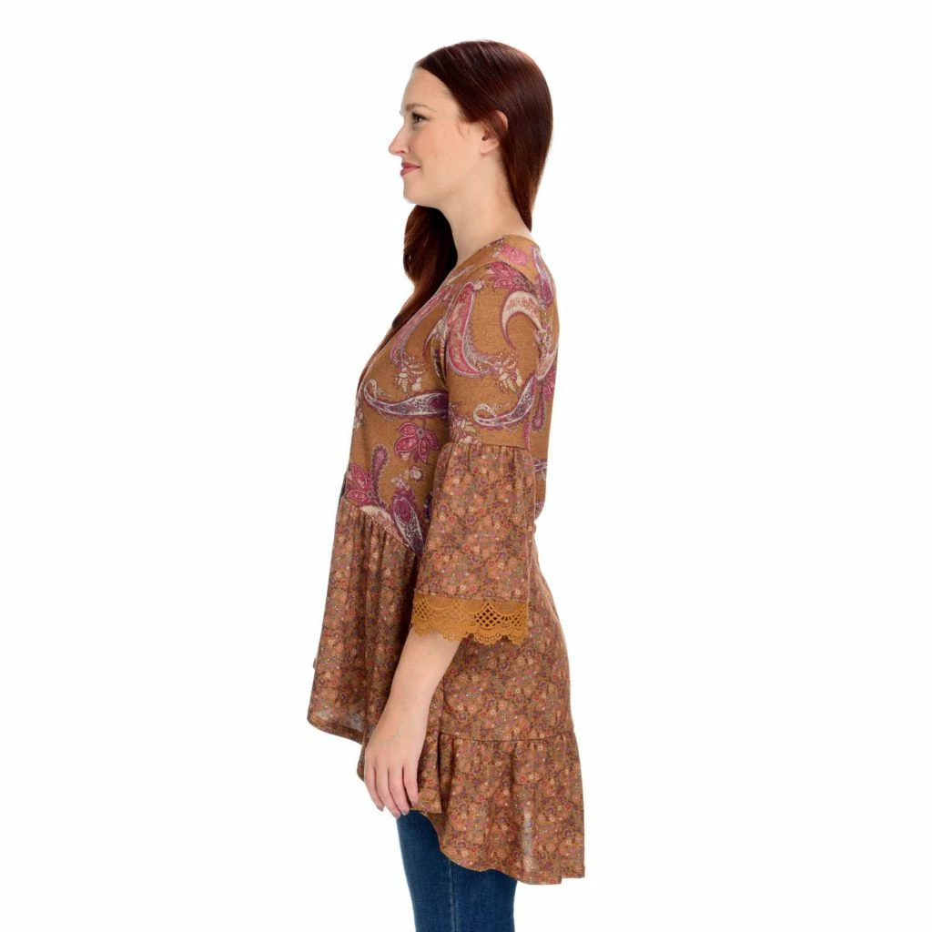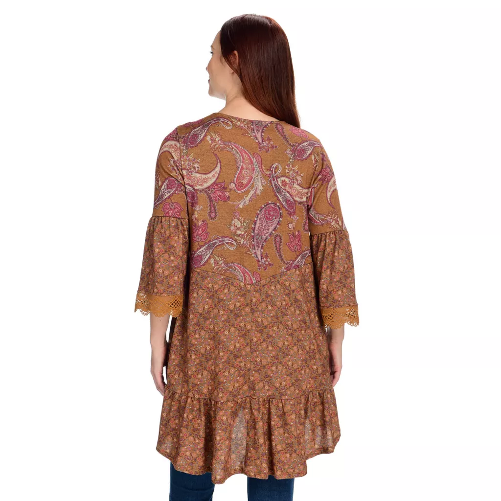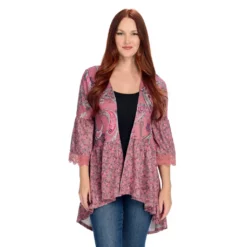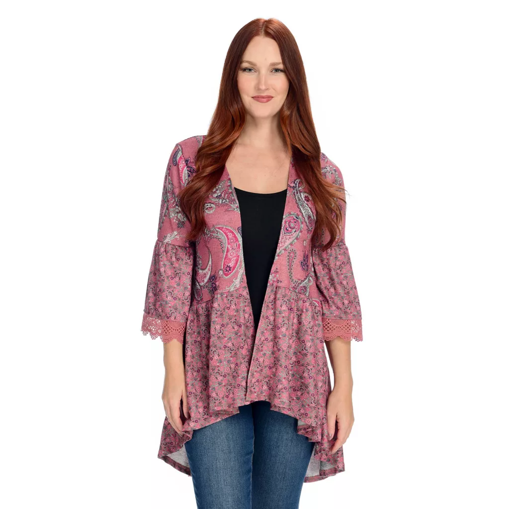 Layer in style with this crochet detailed cascade cardigan from One World! With gathered bell sleeves and a tiered back, this cardigan elevates the silhouette of whatever outfit you wear underneath. The brushed knit fabrication is soft to the touch, making this the perfect layer as weather starts to transition into something cooler. In its mixed print design and trendy colors, you won’t be able to wait to style this cardigan!