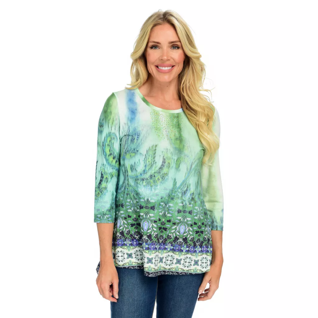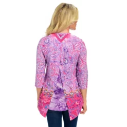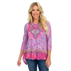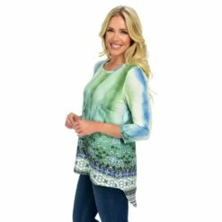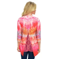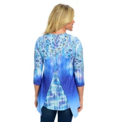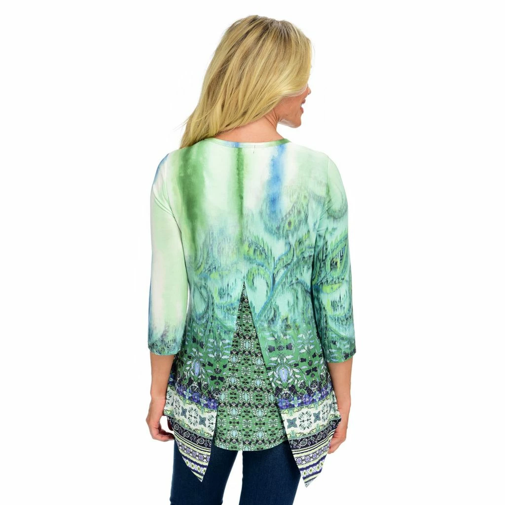 One World has done it again with it’s hand drawn prints. These mixed prints have so much depth and detail they will update your look immediately. The bright colors will also bring you joy through the winter months and into Spring. One World loves color! One World is always about classics with a twist. Your favorite tunic length comes with a split back detail with a 2nd woven coordinating print. You’ll look great coming and leaving. Great with leggings or denim for any occasion.