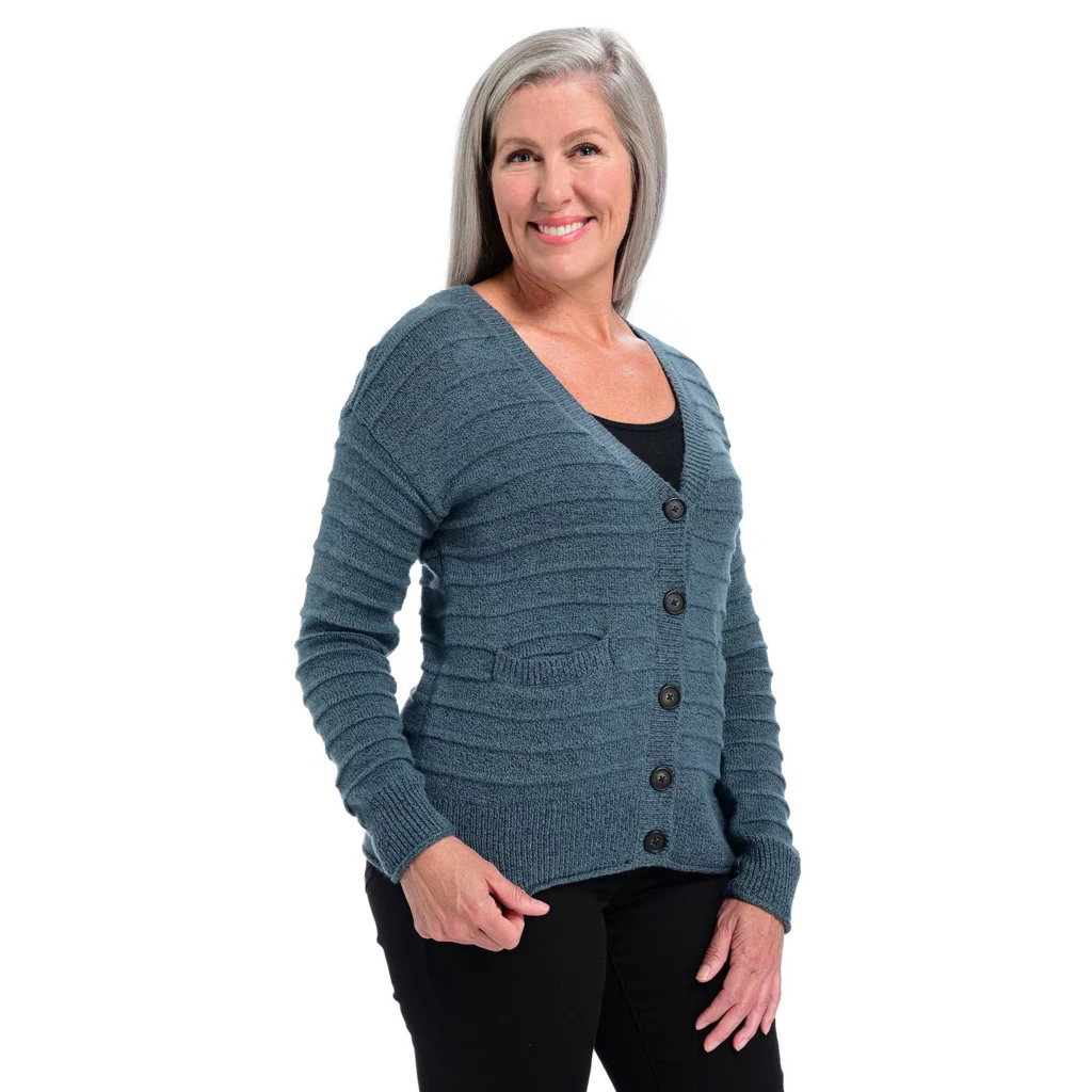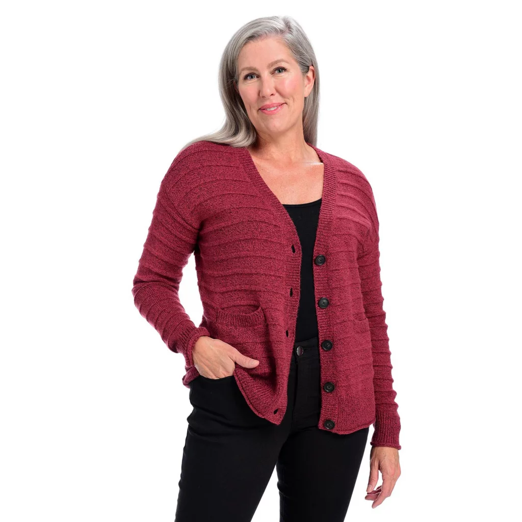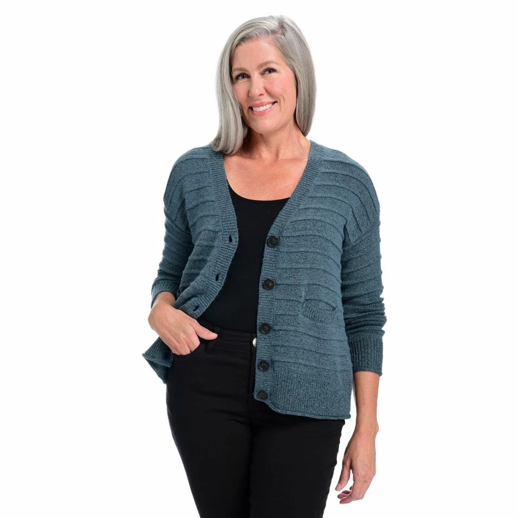Cozy up in this texture-filled cardigan! The ottoman stitch brings raised lines to add texture without adding more color or print. The buttons adds versatility- You can wear it open or buttoned up as a V-neck “pullover”. Yarn so soft and breathable for those transitional months into colder weather.