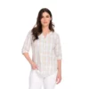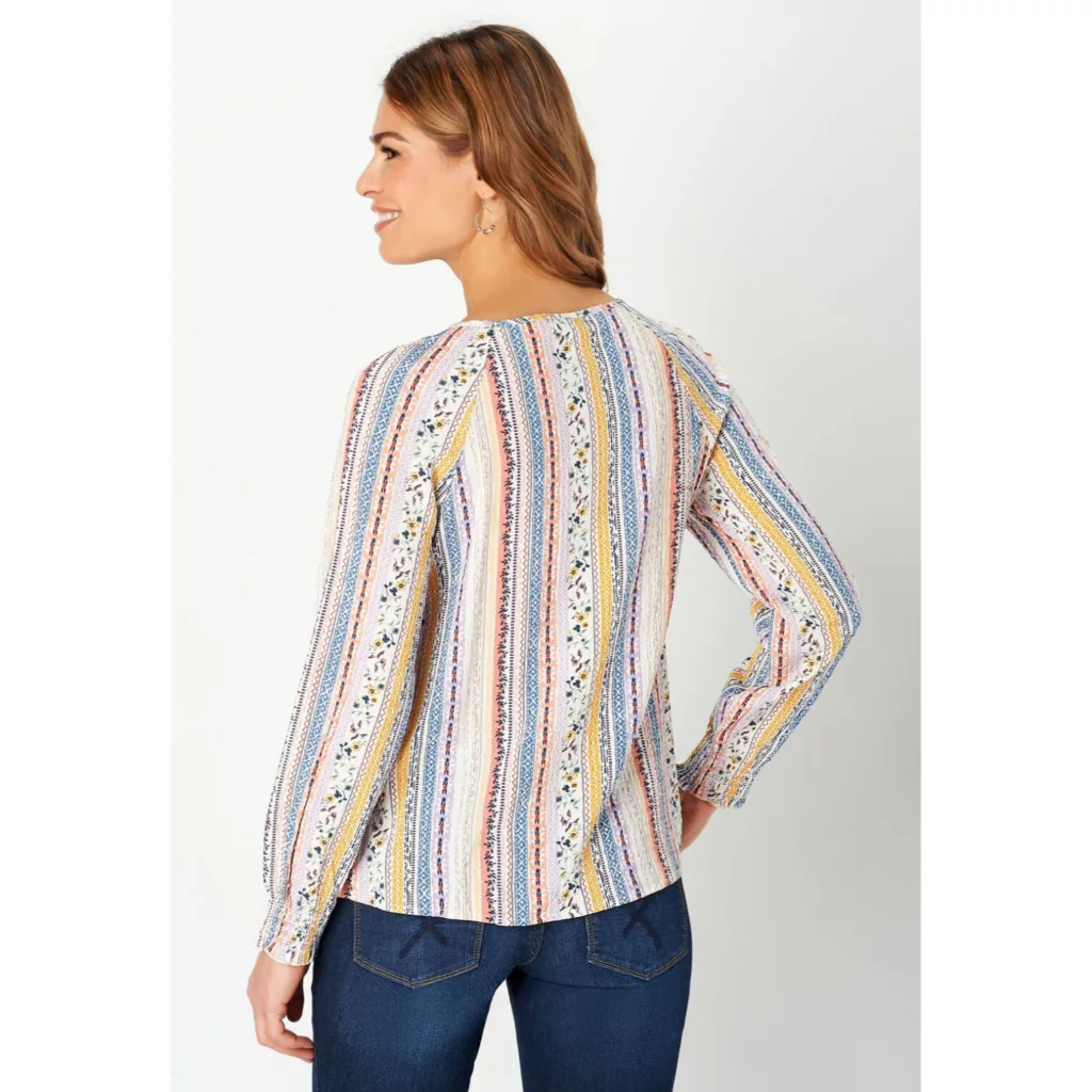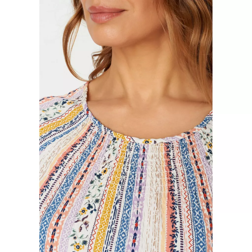 Accented with a mix of colorful floral and geometric prints this textured blouse really brings those boho vibes. It also features stretchy smocking at the neck and cuffs.