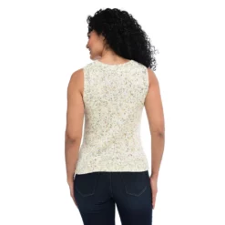Multi-color tweed yarn brings feminine flair to this soft sleeveless sweater. The pointelle stitching up the front gives a lace-like appearance that’s easy to dress up or down. Wear this top with a white or colorful cami for an everyday summer sweater!