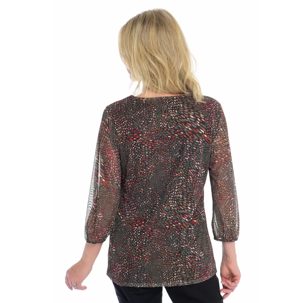 Our Printed Smocked Shoulder 3/4 Sleeve Mesh Top is where elegance meets edge. The smocked shoulders add a touch of sophistication to the airy mesh fabric. With a unique printed design, this top effortlessly balances style and comfort. Elevate any ensemble with this statement piece, perfect for standing out at any event or casual outing.