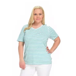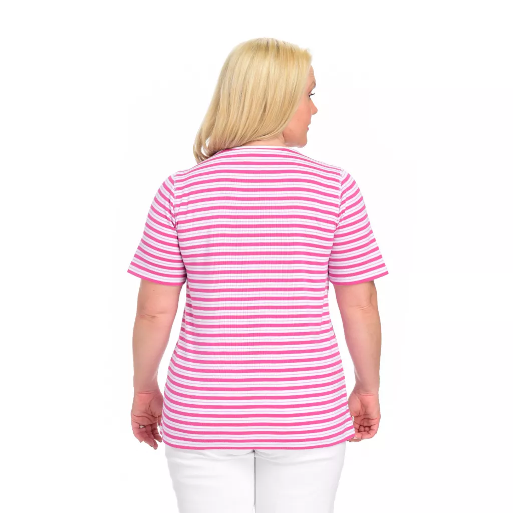 Carefree style in a closet staple, this cotton tee will keep you comfy and cool. Just enough stretch to give you room to breathe while keeping its shape—even after washing. Add a pop of striped color to your favorite pants and skirts.