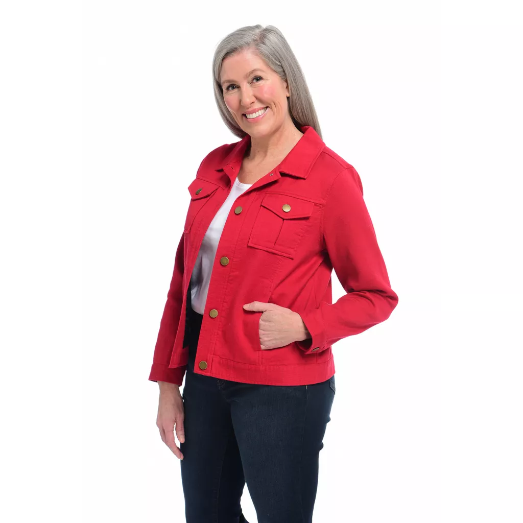 The all-season cotton jacket your wardrobe needs. 4 functional pockets and seaming details make this over piece stylish and useful. Brushed silver-finish buttons add a polished finishing touch! Layer over sweaters and tees for year-round comfort.