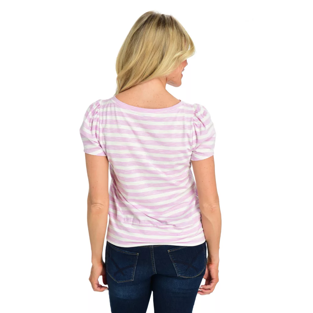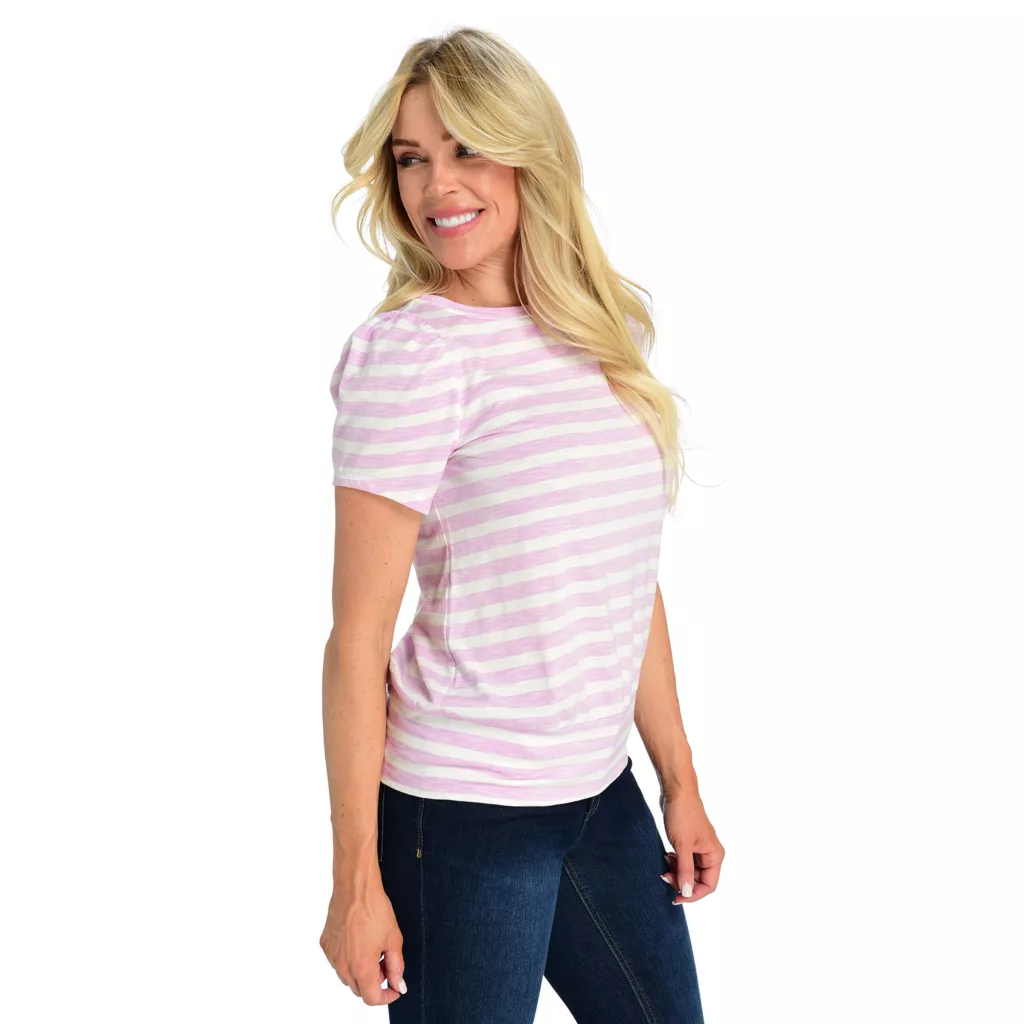 This wardrobe staple has details you will love. Puff shoulder sleeve adds a little fashion into a soft, stretchy boatneck tee. Wear it with your favorite pair of jeans for all-day confidence!
