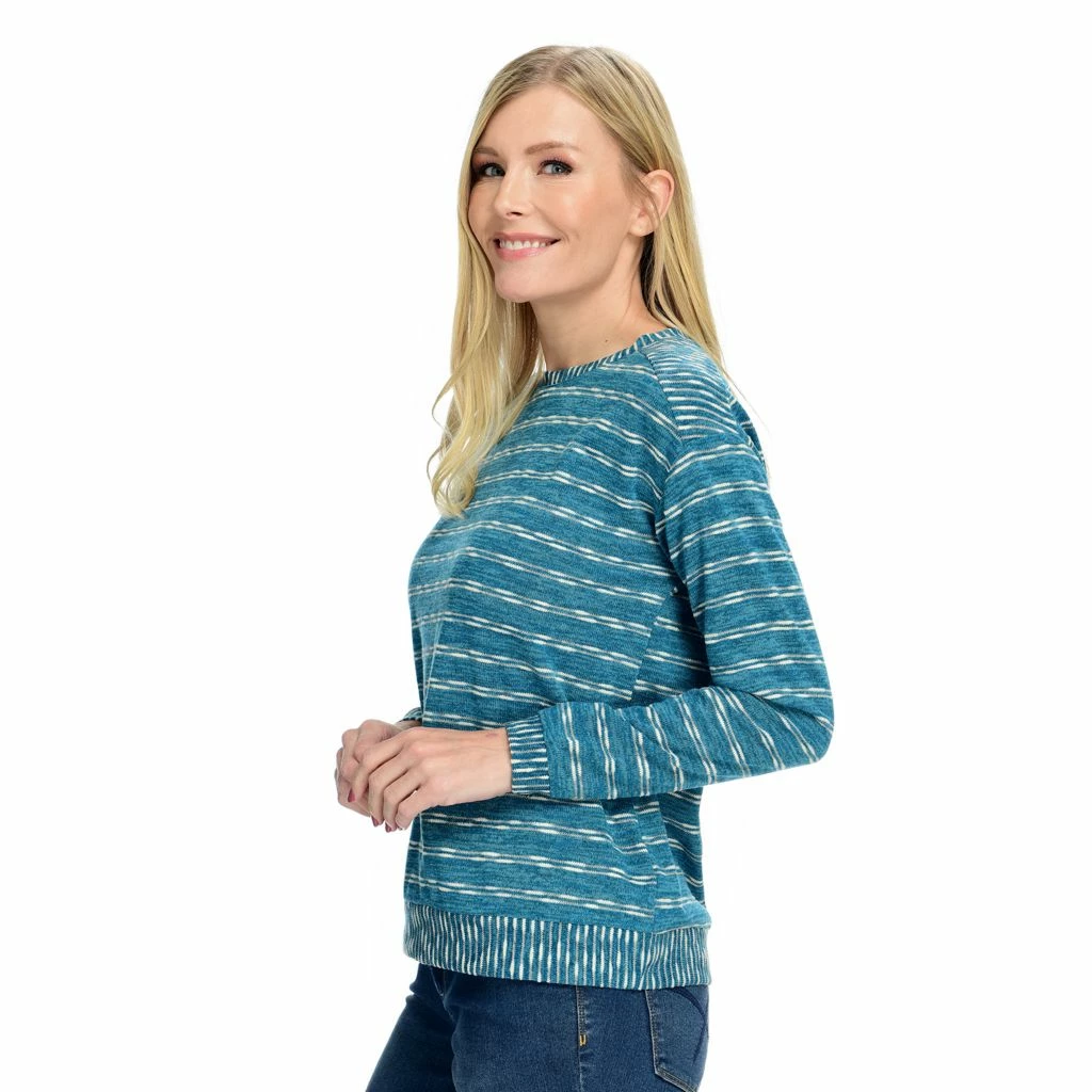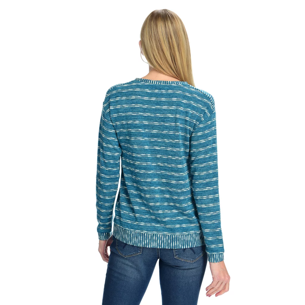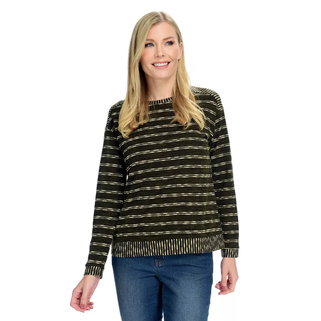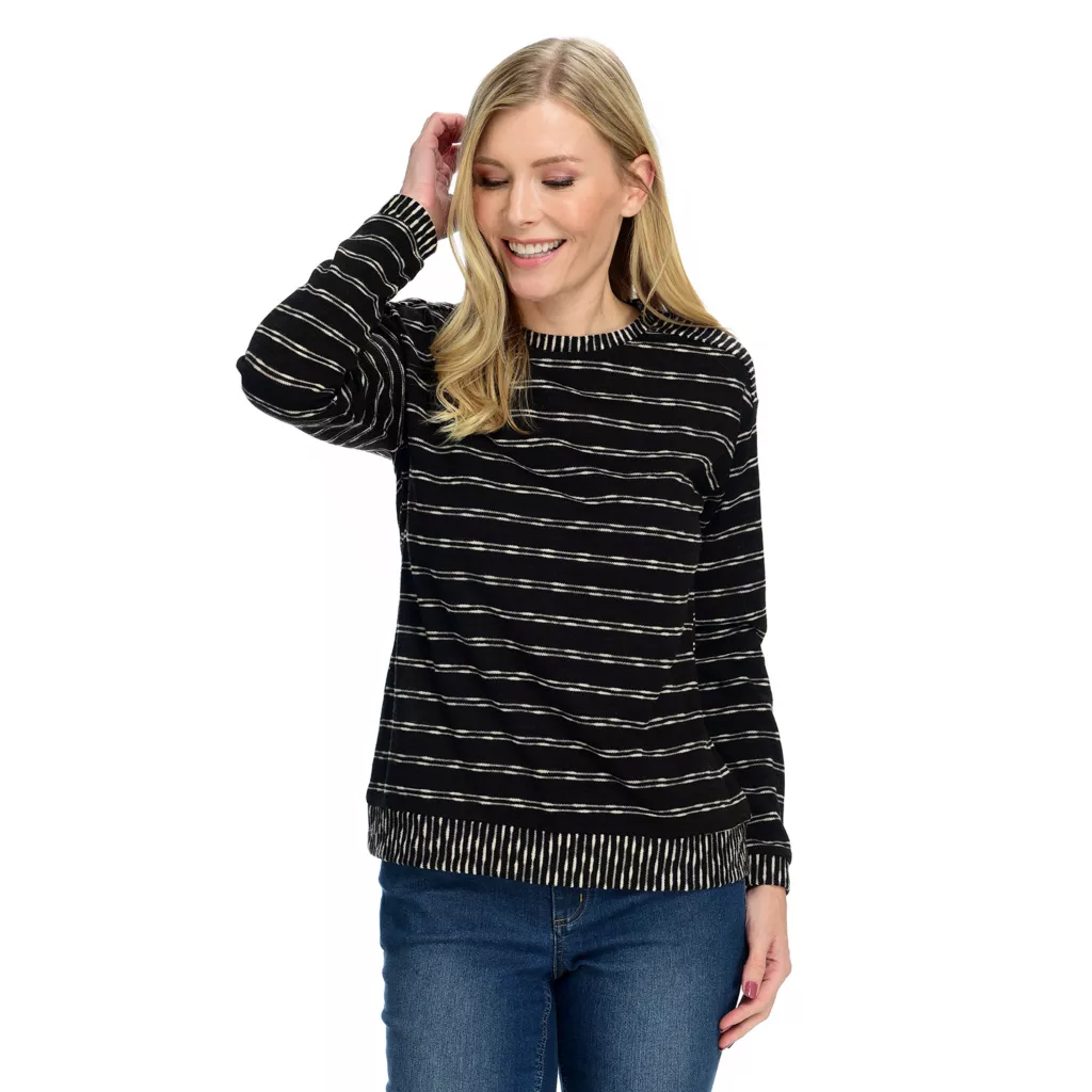 The proven illusion for a timeless pattern, alternating stripes give an alluring look to this classic top. Textured stripes weave throughout the light sweatshirt and contrasting band details elevate this comfortable top.